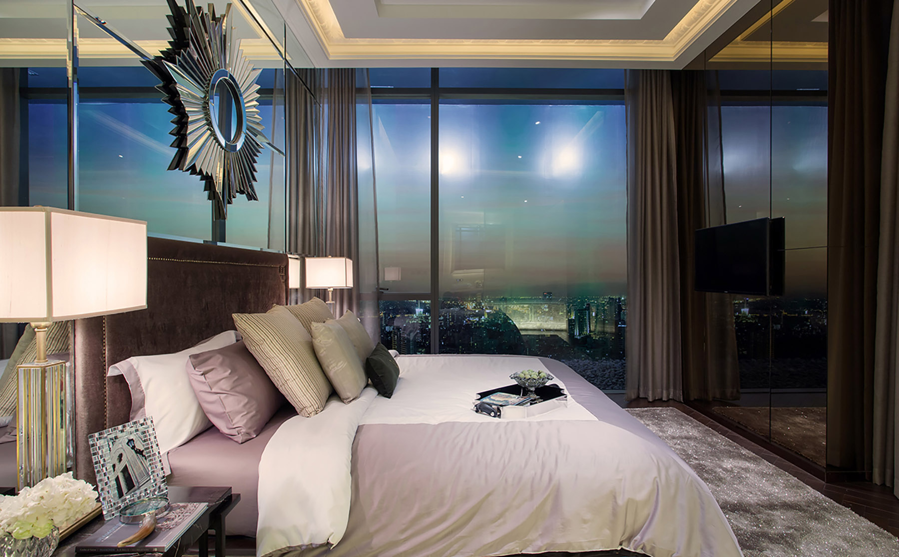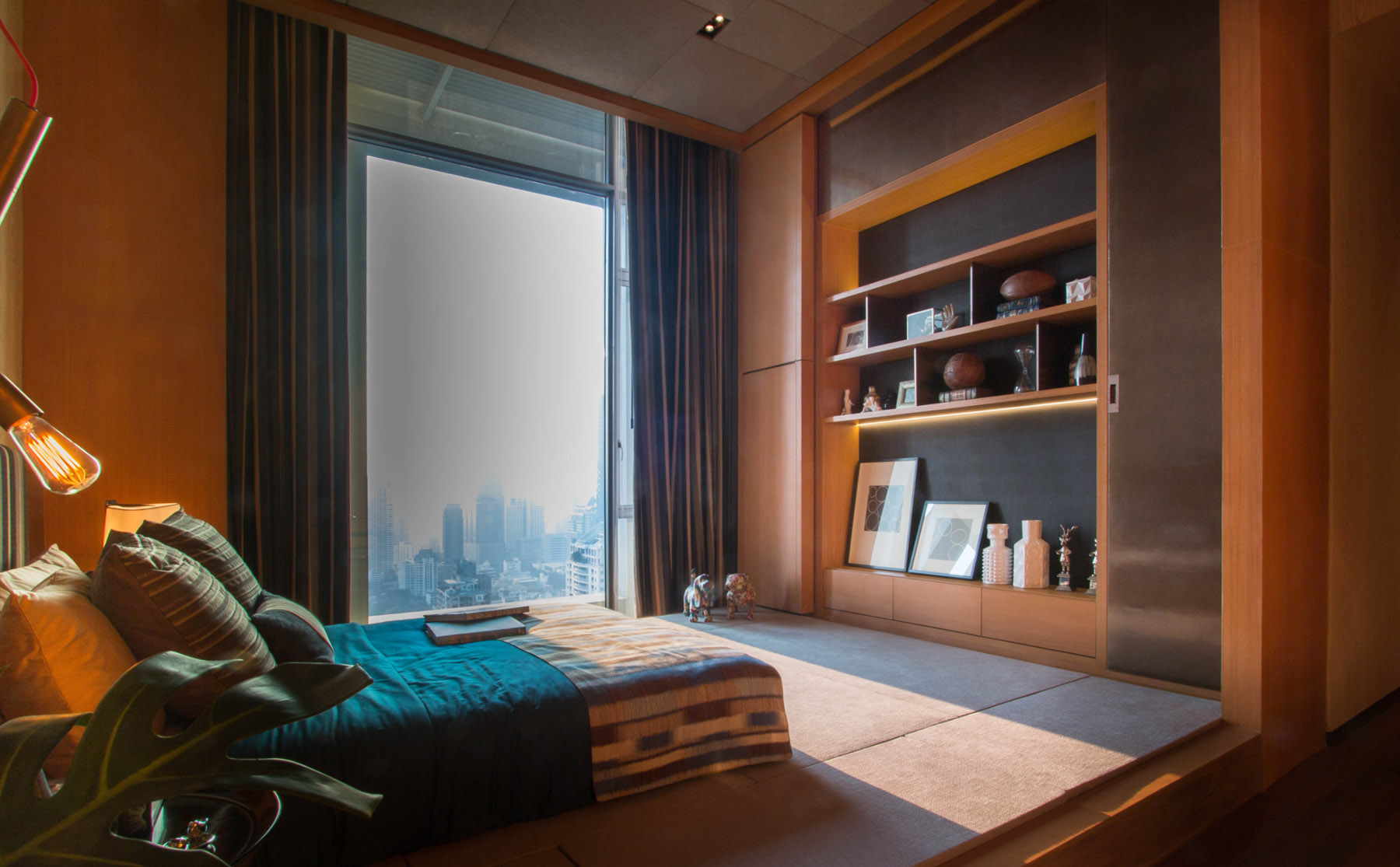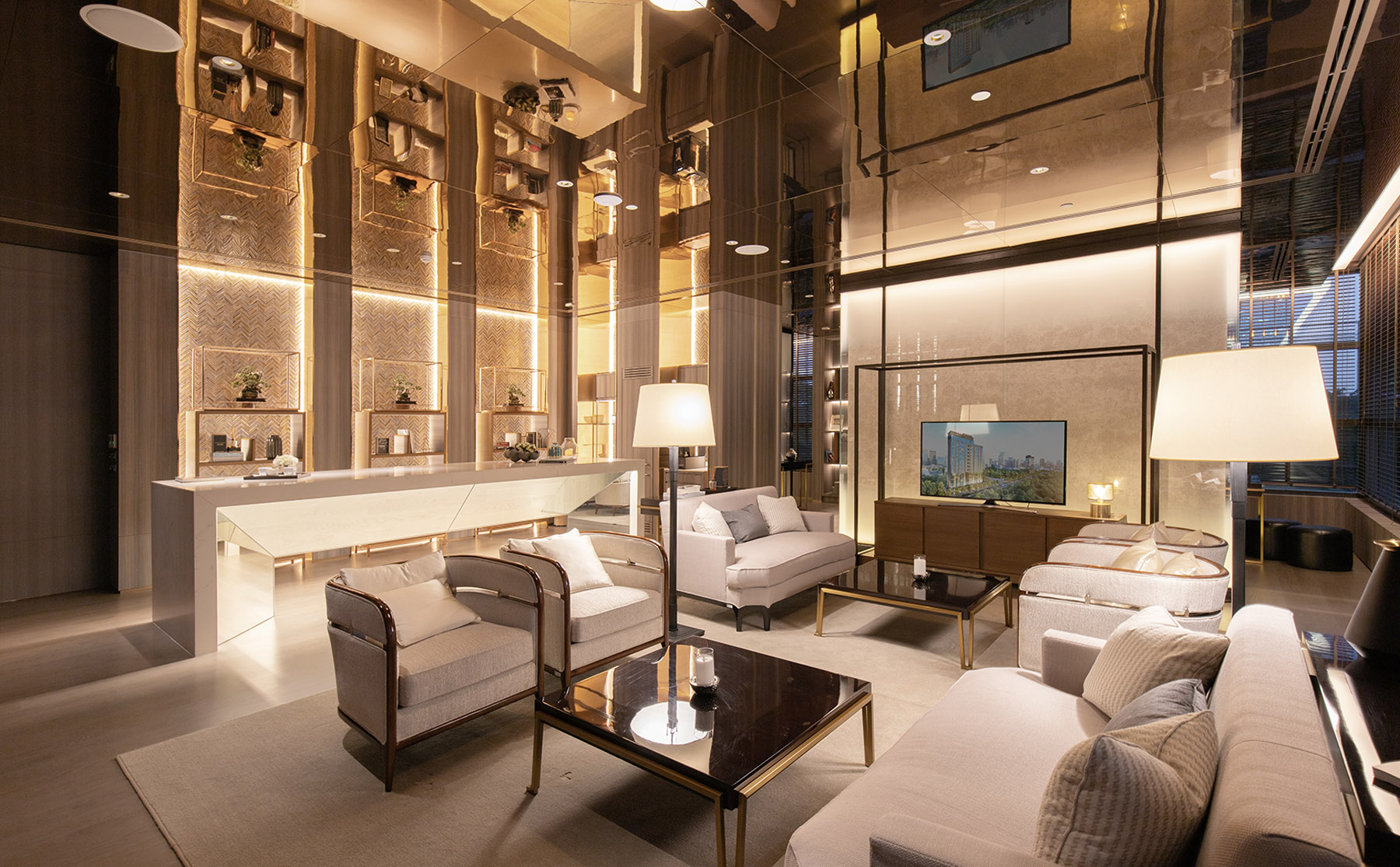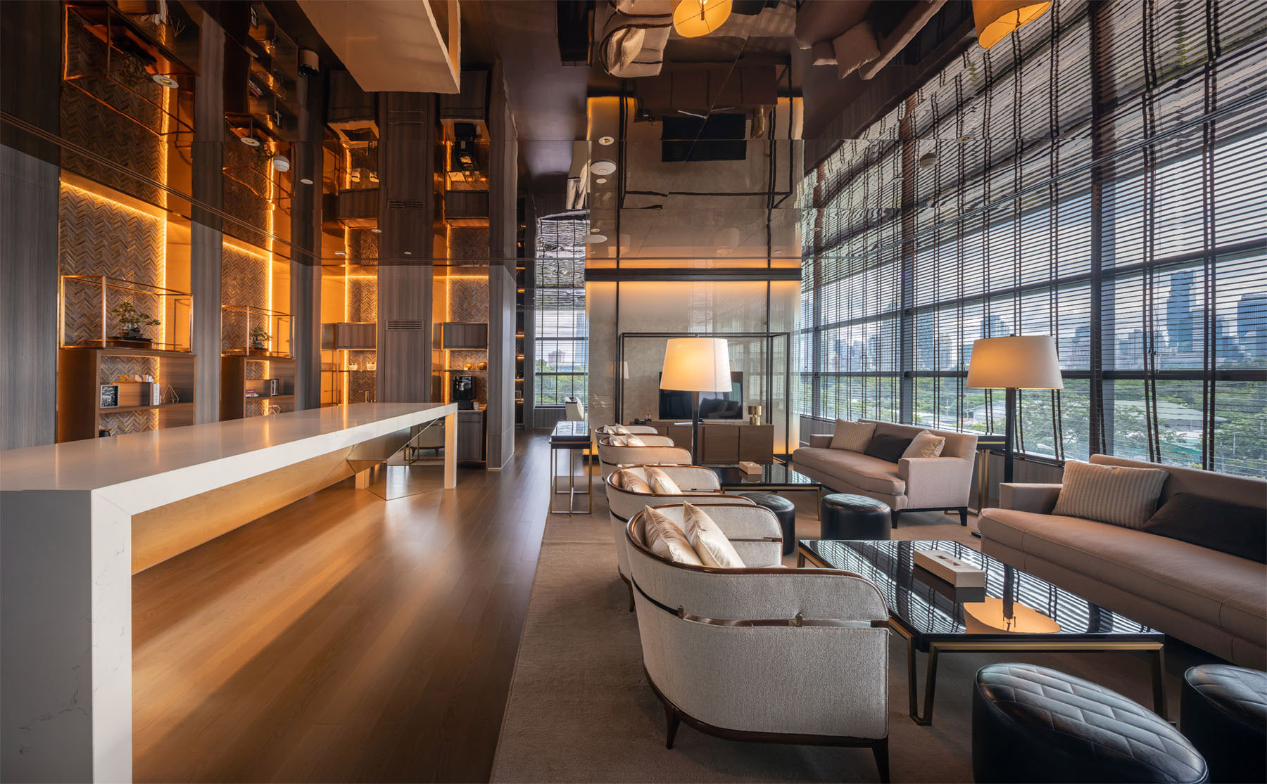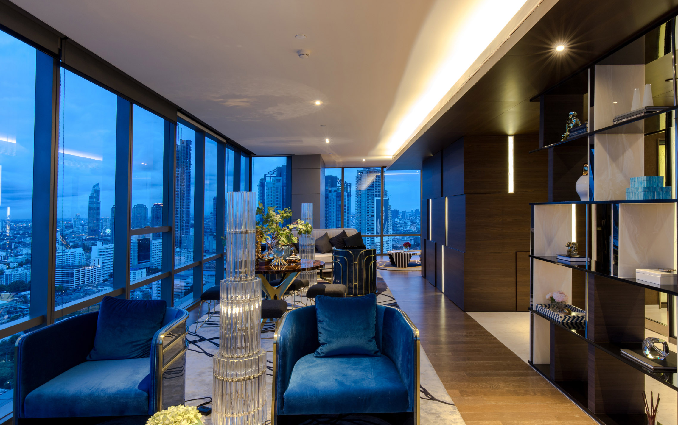 The project is equipped with state-of-the-art facilities and amenities including fitness center, swimming pool, Sky Cigar & Wine Bar and Celestial garden on the rooftop. The spatial arrangement of the building is thoughtfully designed to contribute to the ultimate luxury lifestyle of the residents. Every unit is provided with European kitchen facilities from Poggenpohl, also featured with floor-to-ceiling windows in the living and dining area that are 3-3.4 metres in heights which maximizes natural daylight and allow the residents to enjoy the breathtaking panoramic views of the Bangkok skyline.