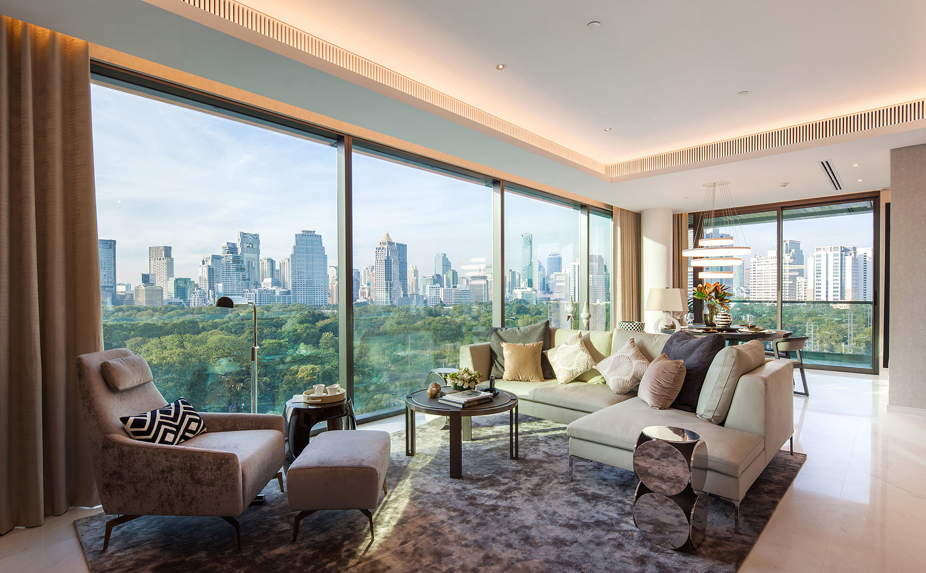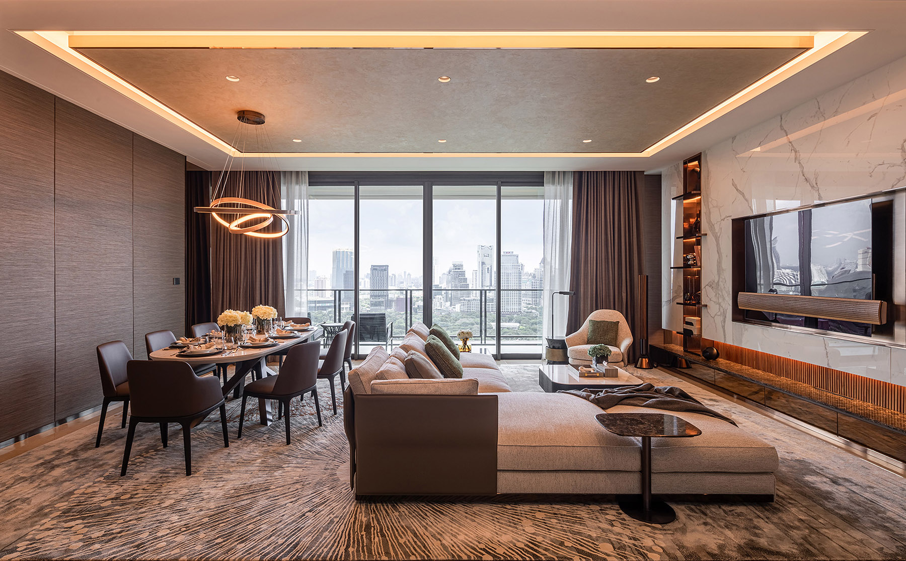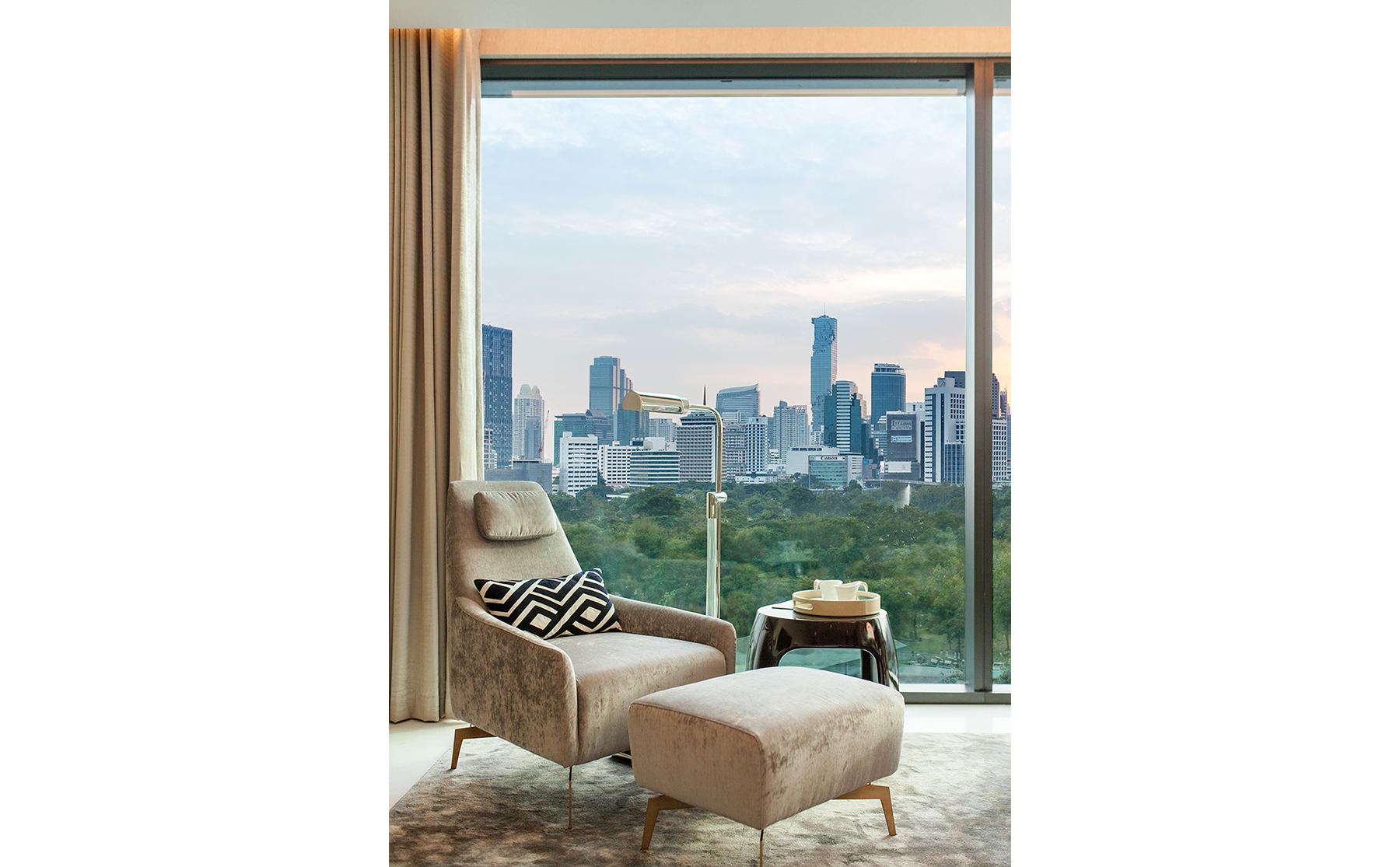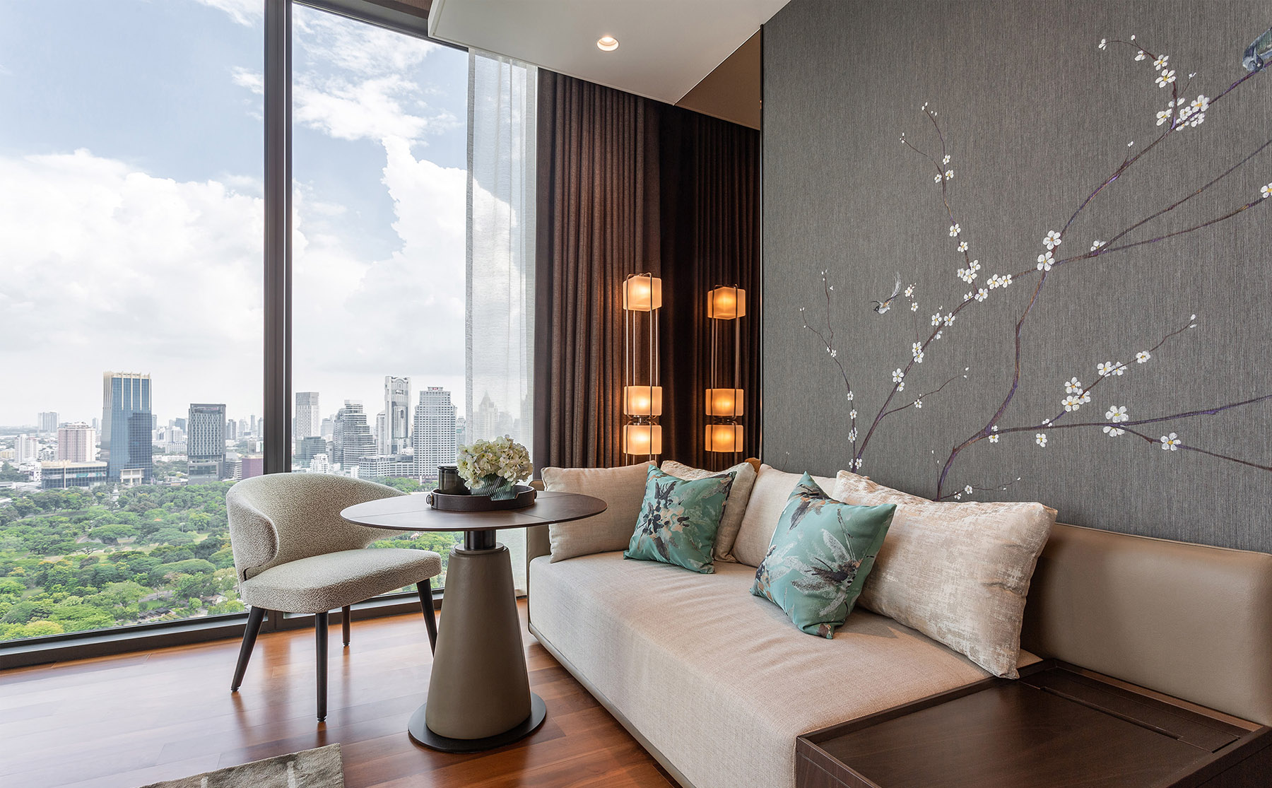 The residence lounge at Sindhorn Langsuan has been meticulously designed to enjoy the picturesque panoramic view of Lumpini park. It is an oasis of tranquility and privacy in the middle of Bangkok. Only materials of highest standard have been selected for enduring utility and distinction by the hands of professional craftsmen.