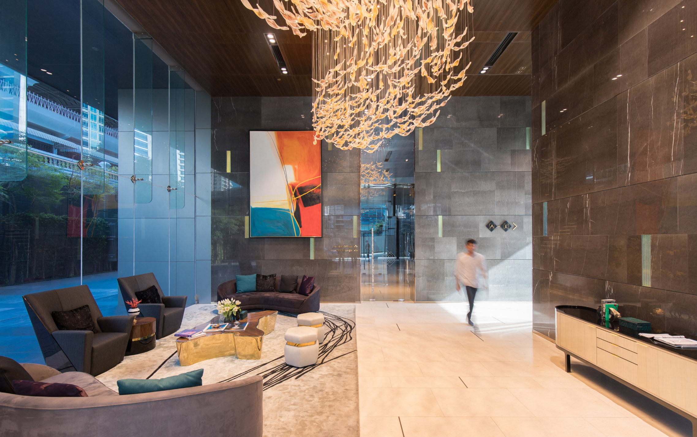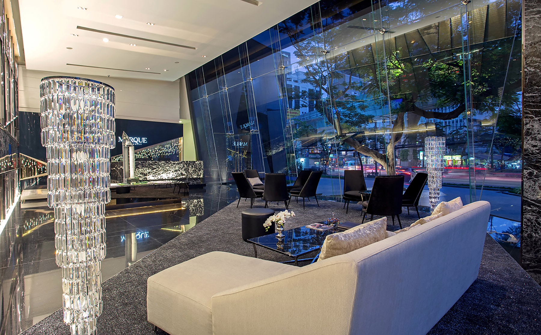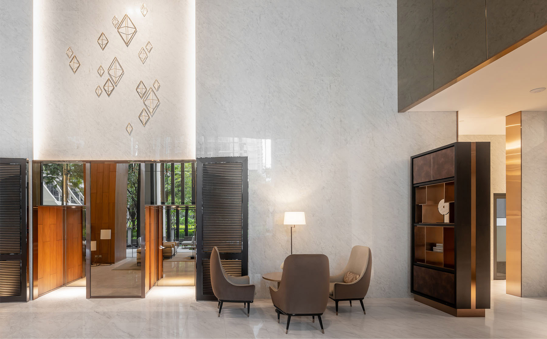 Marque Sukhumvit is a 222-metres-high residential condominium of 149 units. The building’s design inspiration comes from marquise diamond shape which reflects the opulent lifestyle of the clientele around Sukhumvit area. The interior decoration respectively adopts this concept by interpreting the form and shape of a diamond into the use of shiny high-quality materials and meticulous design under the theme of ‘Metropolitan Luxe’.