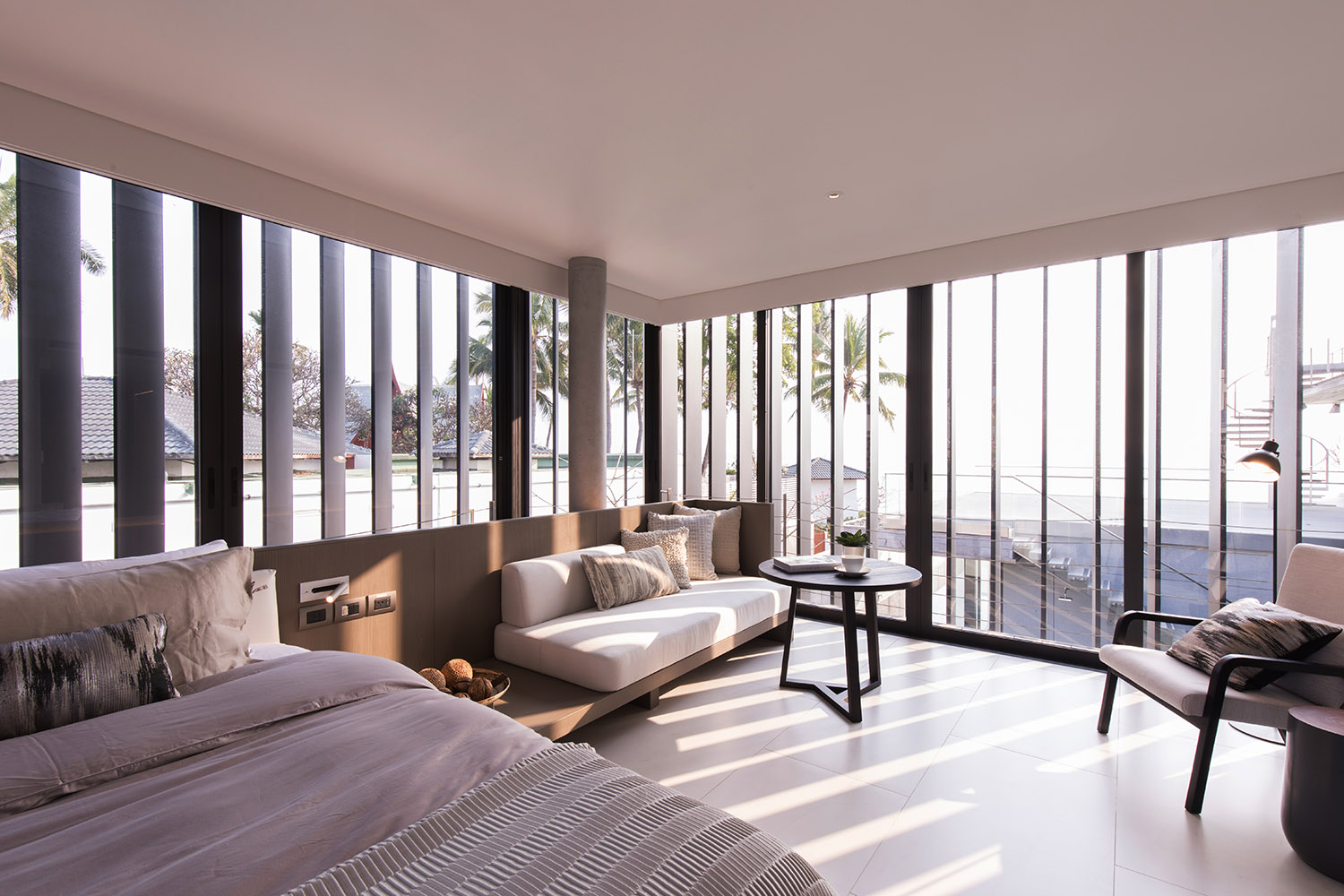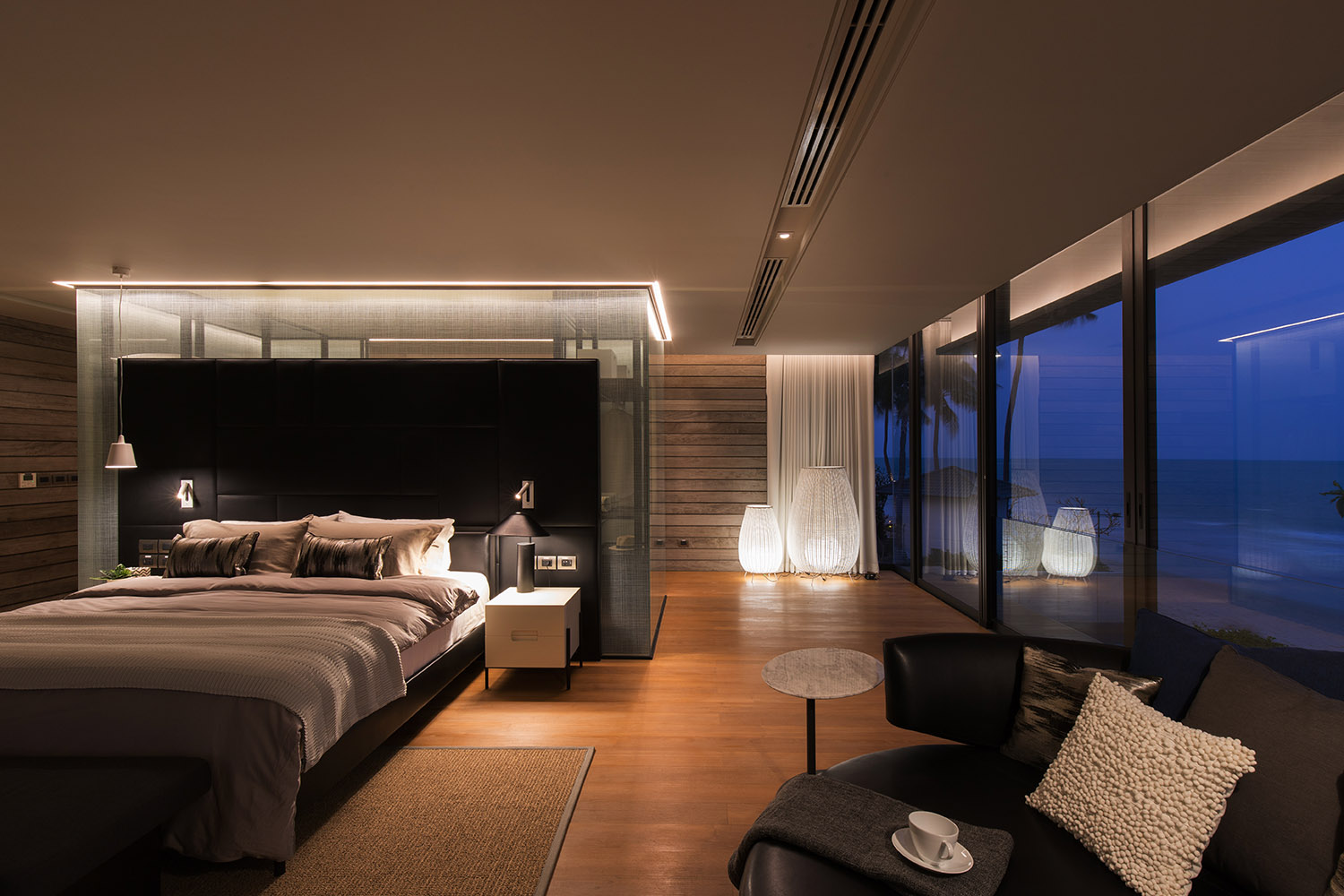 YL residence is a 2-storey vacation house with a total area of 800 sq.m., consisted of co-living space, 5 bedrooms for family members and a service quarter for housemaids. The owner’s main requirement is the unity of the entire house that reflects her fondness for minimalism and modern architecture. The building is located in a secluded street that leads to a public beach which gives a breathtaking seascape for the owner. However, its location also became a design challenge for us due to the local regulations regarding the setting back distance that restricted the ceiling height. As a result, we designed an open-space layout featuring bands of floor-to-ceiling glazing to echo the surrounding landscape, further blurring the boundary lines between the inside and the outside. We worked closely with the architect in order to determine the design direction and specify details and materials to be used throughout the house. A palette of natural materials – bare concrete , bush-hammered granite and weathered red wood are combined with the modernist spirit of Less-Is-More, subtly imbues the house with rustic aesthetic that nevertheless feels contemporary.