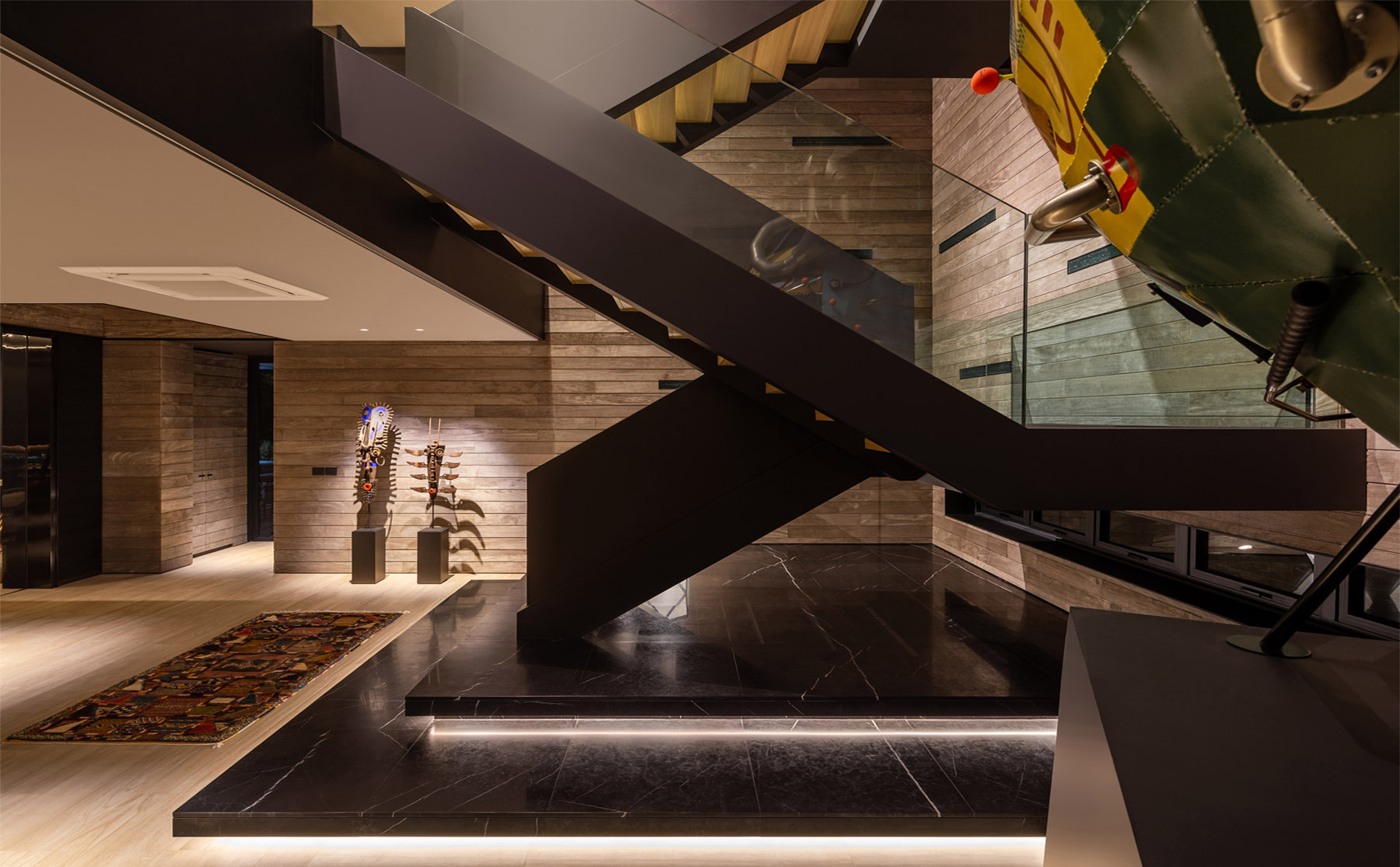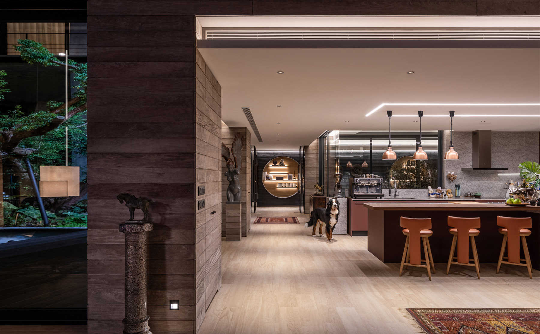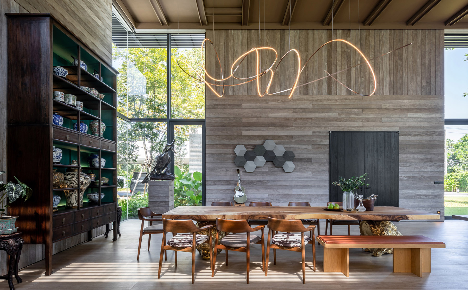 PC House is specifically designed to reflect the owner’s identity through the contemporary and unique mood and tone of the house. Throughout the 1,300 sqm. Interior space, the continuous sense of comfort is realized through the combination of natural materials like 6-month-dried red wood and the Japanese Yakisugi wood. His private collections of artworks, artifact inheritance, and his pursuit for music are used in various areas in order to complement the interior design.